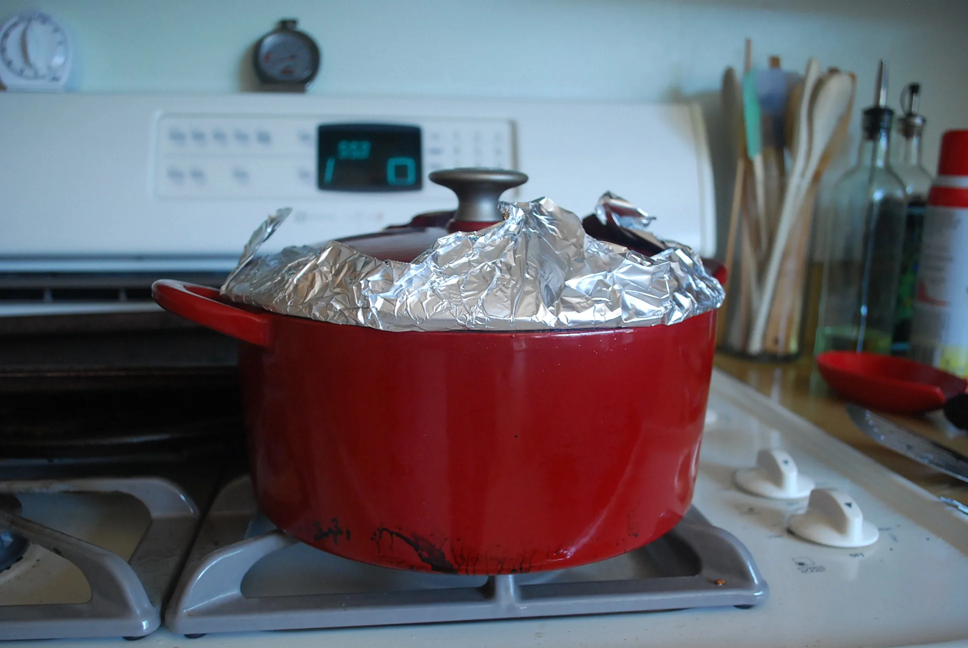 When the wine comes to a boil, cover the pot tightly with a piece of aluminum foil and the lid. Slide the daube into the oven and allow it to braise undisturbed for 1 hour.