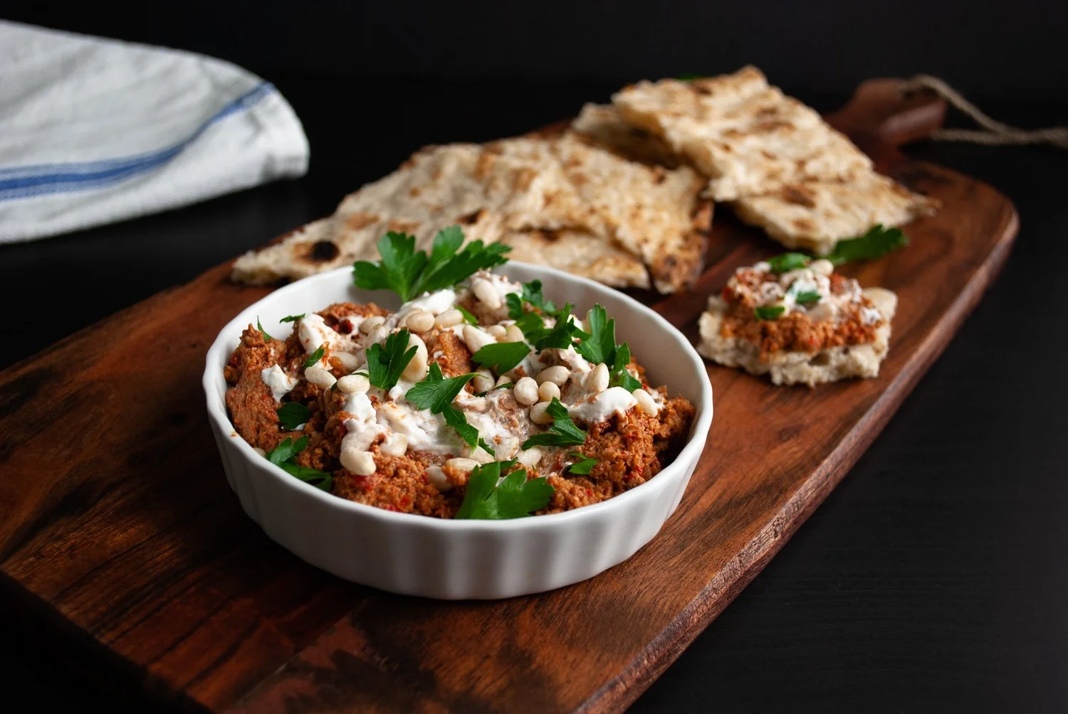 7. When ready to serve, transfer the muhammara to a serving bowl, swirl in yogurt and sprinkle with chopped parsley and drained soaked pine nuts. Serve with flatbread.