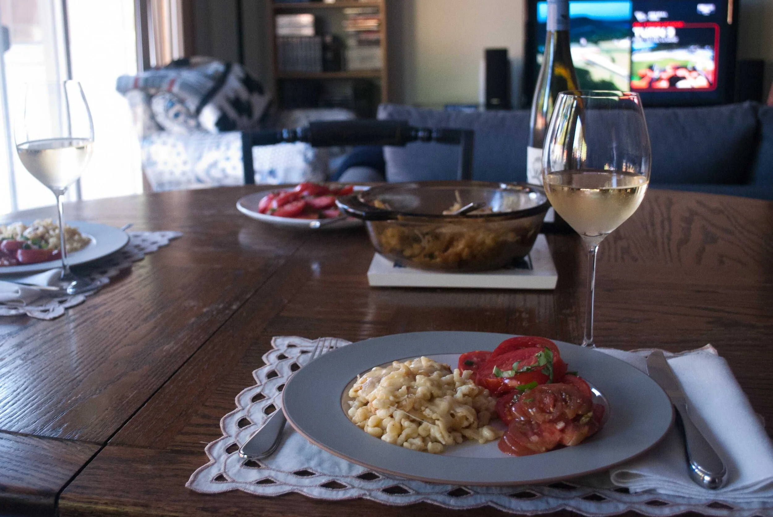 Last weekend was Austrian appetizers, this weekend was dinner and dessert! I finally got up the nerve to make spaetzle. It turned out to be pretty easy. Even without a spaetzle-maker. I ended up using a cheese grater held on its side and a wooden spatula to scrape the dough through the large grater holes. The noodles were smaller than they would be with a purpose made tool, but tasted great and cooked super fast. You could top these noodles with just about any sauce, but the gruyere and caramelized onions are a savory, sweet, and wonderfully warm addition to the simple noodles. Baked until creamy and melted to perfection, I highly recommend the combination. We served the noodles alongside a fresh tomato salad with a nice tangy dressing. And of course I shouldn’t forget to mention the wine! I found a crisp white wine from Austria at my local Total Wine: Gruber Roschitz Gruner Veltliner Roschitz, it wasn’t too sweet and paired well with the meal.